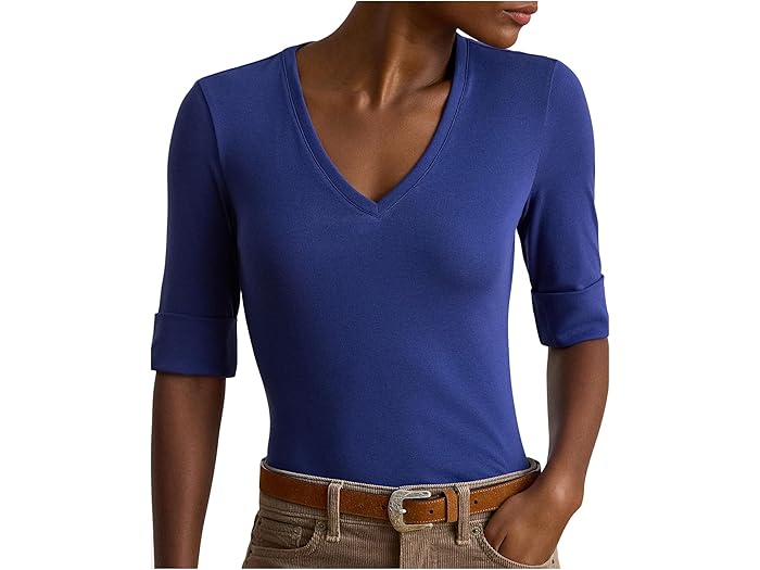 Stretch Cotton Elbow-Sleeve V-Neck Tee
