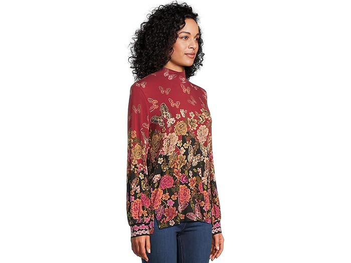 - Rich and romantic, this mock-neck top is adorned with a cascade of florals and butterflies in warm, jewel-toned hues. Set against a deep red backdrop, its relaxed fit and elegant drape bring effortless sophistication to both casual and dressy looks.